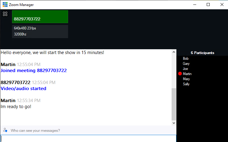The chat window will allow you to communicate with each participant and also show important information about the current meeting, such as who has joined and meeting information such as join urls and meeting IDs and passwords if applicable.